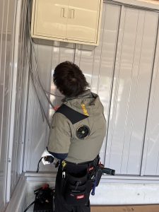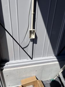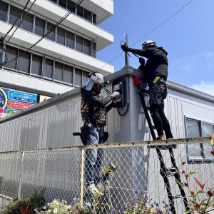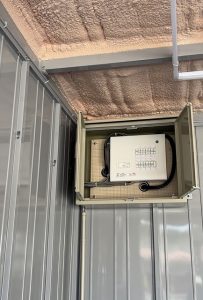 後日、隣に設置されたプレハブ事務所にエアコンの取り付け、コンセントの増設等を行い、工事終了です。