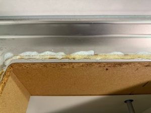 ビルトインコンロの本体周りには黒いゴム、パッキンがついています。さきほどの頑固な油汚れが取れたおかげで新しいコンロも隙間なく平坦にスッポリおさまります。