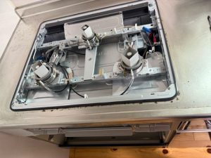 あとはいつもの作業通り、本体を固定してガスを繋ぎなおし、天板をセットして試運転したら完了です。今回お取付させていただいたビルトインコンロはパロマの”リプラ”、スタンダードなタイプですが、天板はハイパーガラスコートトップでお手入れ楽チン、全ヶ所にタイマー機能がついていて魚焼きもオートグリル機能付きで、マジックリン同様、コスパ良の商品です。