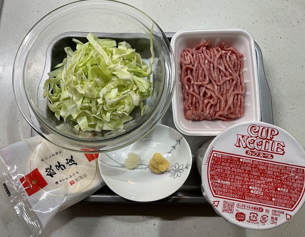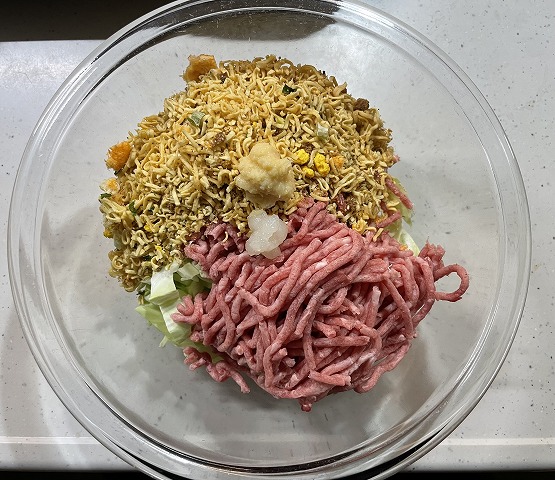ボウルに砕いたカップ麺、ひき肉、キャベツ、ショウガ、ニンニクを入れ、手でこねてタネを作る。