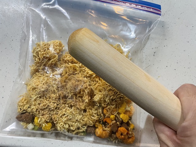 まずは、カップ麺を丸ごと入れて砕く。
