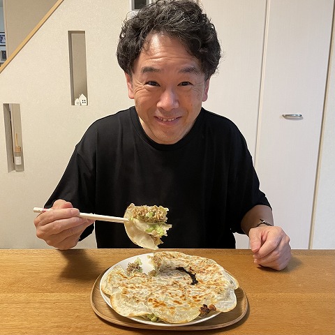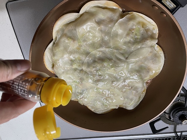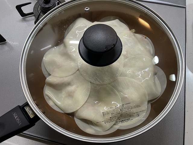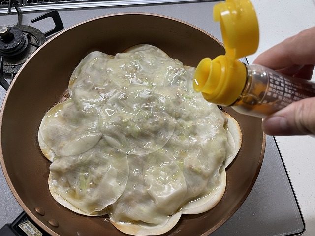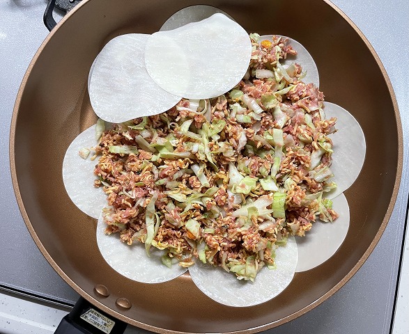 フライパンに餃子の皮を敷きならべ、タネをその上にのせ、その上から餃子の皮を重ねていきます。