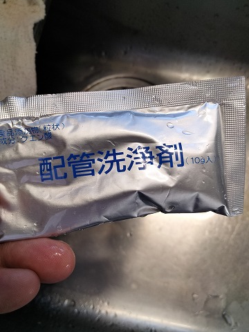 配管洗浄剤も忘れずに投入しておきます。こちらは、カルシウム等の付着を防止し、電解性能を良い状態で作り出すためのもの。