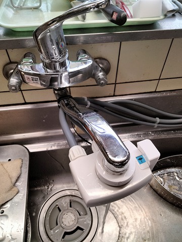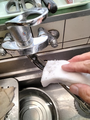 台所水栓の掃除もさせていただきました。メラニンスポンジで軽く磨くとピカピカになります。