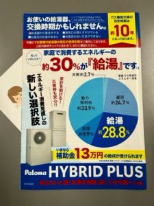 今回の展示予定となっている物のひとつに、パロマの「ハイブリッド給湯器」という器具があります。ハイブリッドというと「電気とガソリンで走る車」のようなイメージが強いと思いますが、給湯器でもハイブリッドというものがあって、「ガスと電気で動く給湯器」とイメージしてもらえたら分かりやすいかと思います。