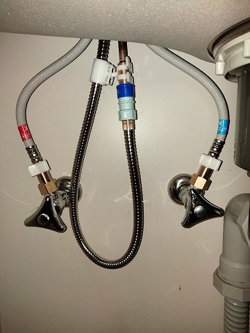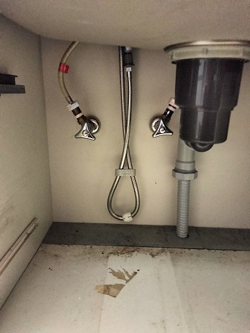 シンク下にある止水栓のバルブをしめて水を止めナット類は外しておきます。