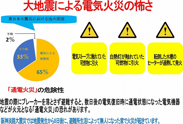 通電火災とは、例えば電気ヒーターなどを使っている状態の時に地震が発生するとします。