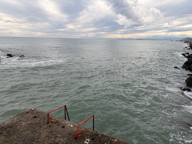 僕の立ち位置付近にはテトラポットがあったのですが、そこに打ち付けられた波がしぶきになって少しかかってきました…