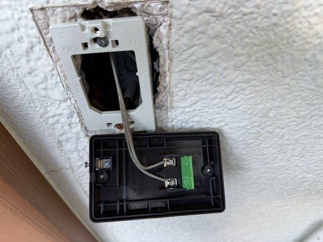 取り外して配線をつなぎ直し、新しいチャイム用押しボタンを取り付けていきます。