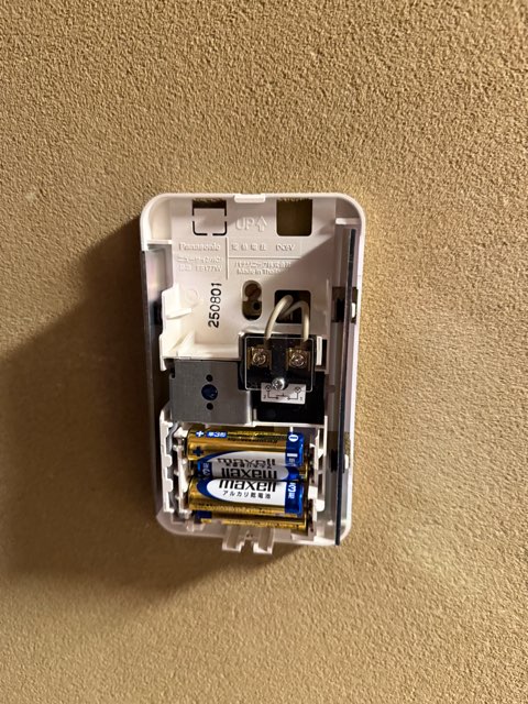 配線をつなぎ直して壁に固定していきます。今回はPanasonicのニューサインホンという商品で、玄関チャイムに単三電池4本を使用します。
