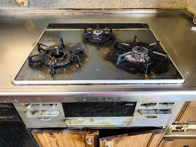 コンロバーナーの点火状態が悪くなっていたようですが、料理で使えるぎりぎりまでご使用されていたようです。吹きこぼしと焦げつきが多く見られます。