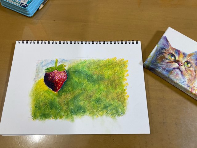 続いて、これは私が描いたイチゴ。このアートクレヨンは色を重ねる事ができて、濃い色の上にも白色がハッキリと綺麗に描けます。また、スイスイ色を伸ばす事が出来るので指でなぞると綺麗に混ざり合います。グラデーションもこれで綺麗に描けます。
