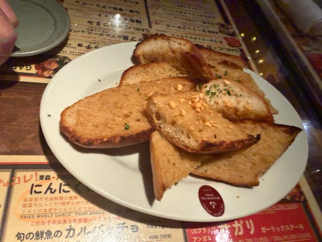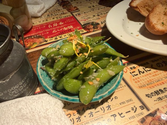こちらはお通しのガーリックトーストと枝豆。枝豆がてかりながら白い物体を浴びていますが、コレもニンニク。どちらも美味しい、ニンニクなのにアッサリしている・・・