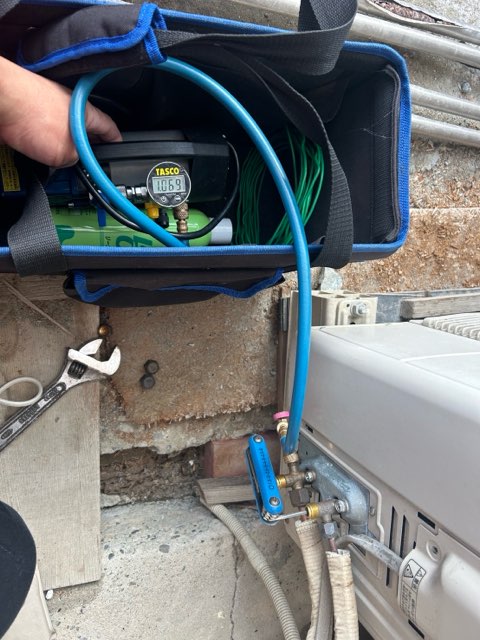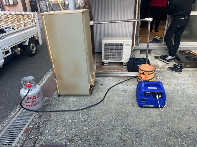 エアコンは処分する前に冷媒ガスを室外機に回収しなければいけないのですが、空き家で電気が通っていないため、ガス発電機を用いてエアコンを動作させてポンプダウンしていきます。