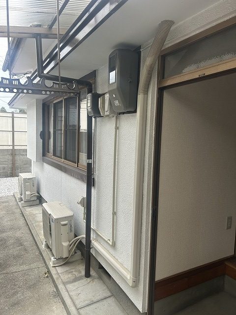 外部は軒下から配管類が出て、犬走りに室外機が設置されていました。