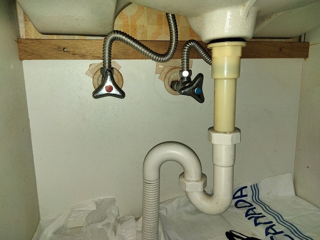 交換作業は洗面台の下にある給水管と給湯管のどちらの止水栓も閉めます。