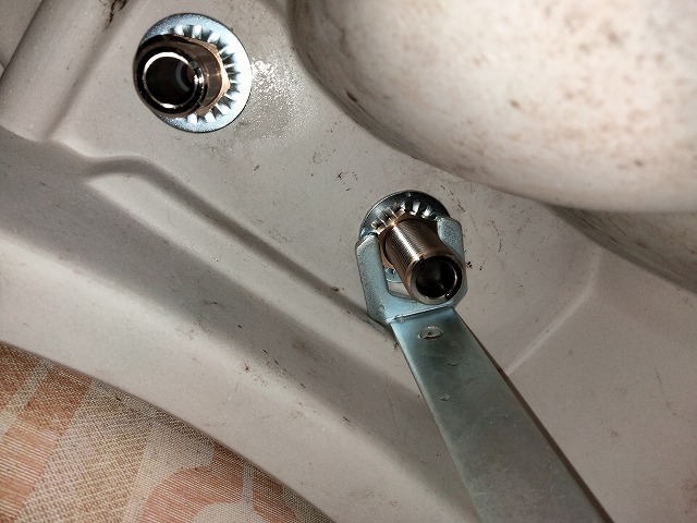 洗面台の下からパッキン、ワッシャ、ナットの順番で取り付け固定します。給水・給湯管を接続し蛇口と止水栓へつなぎます。