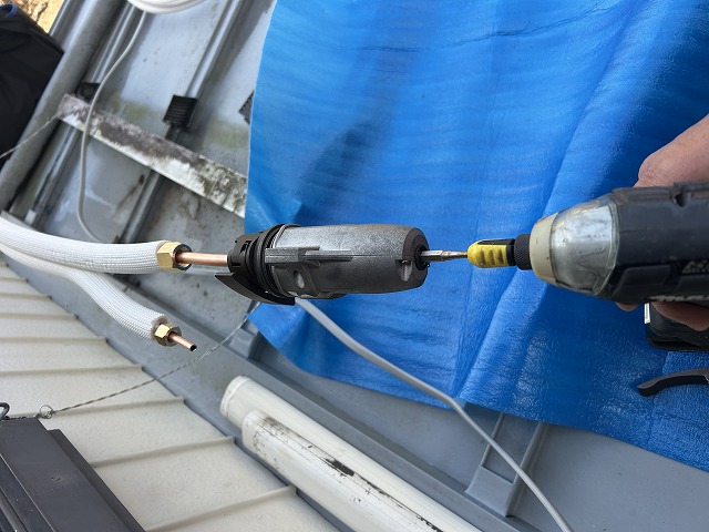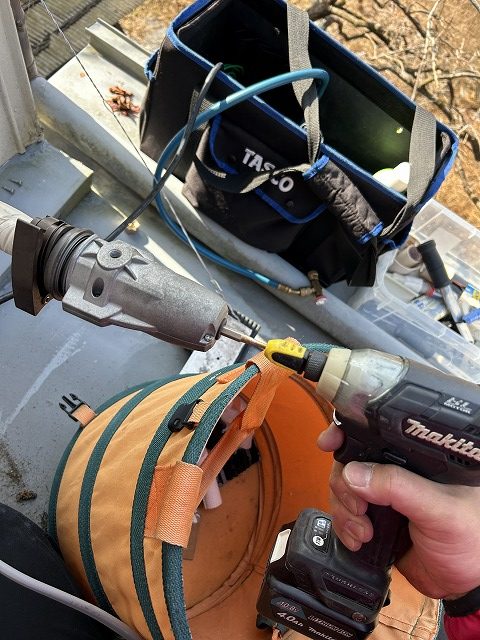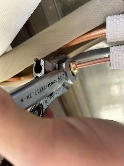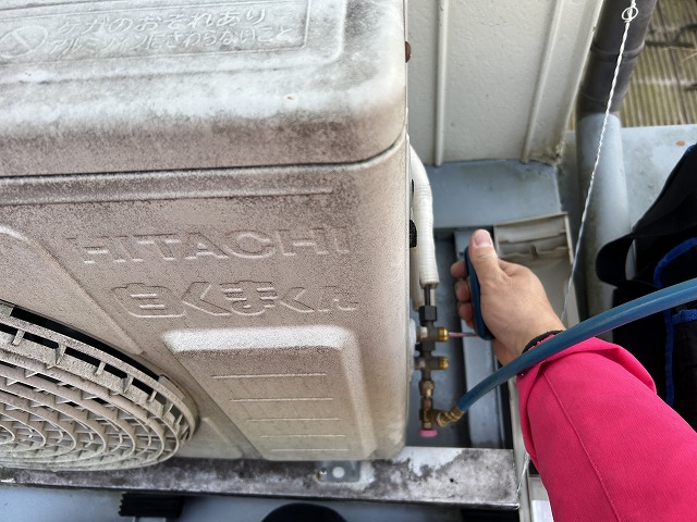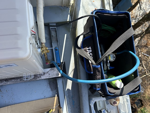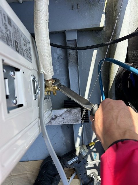 エアコン本体・配管内の空気を抜いて気密確認を行い、問題なければ次に冷媒を通します。