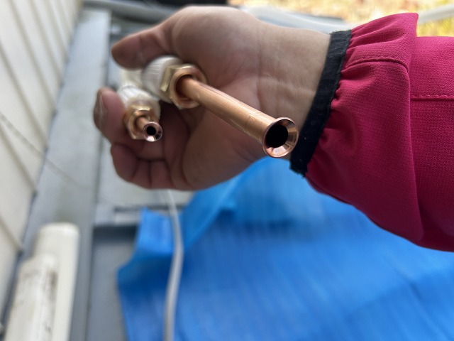 冷媒回収後、室外機との配管繋ぎを外し室内機と室外機の撤去を行いました。