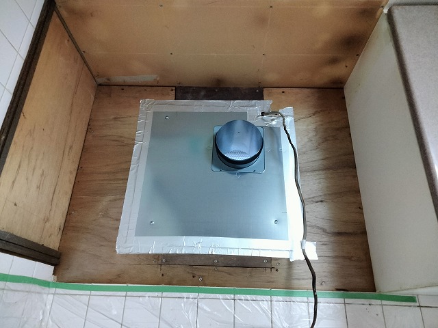 メーカーのプロペラ換気扇取替えキッドを使って、次にレンジフード本体を取り付け作業を進めます。