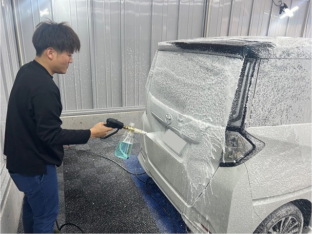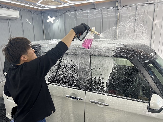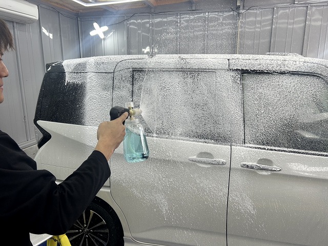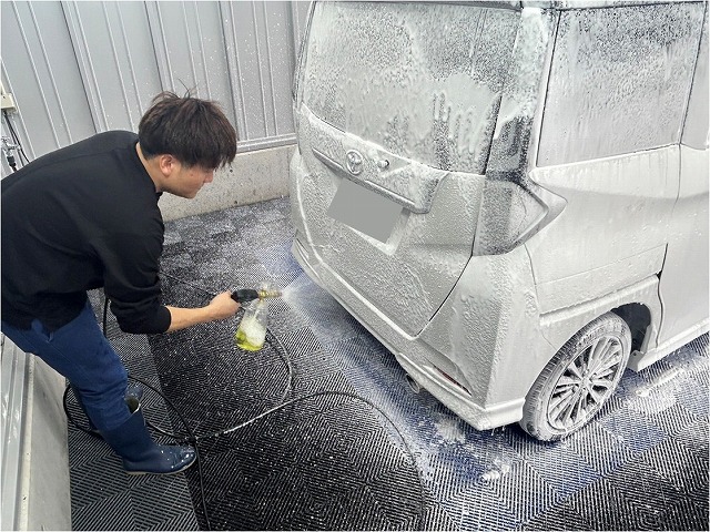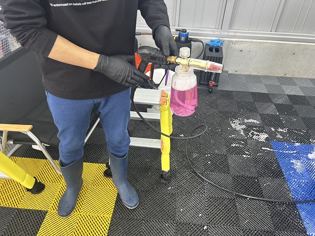 車全体を泡で包んで数分放置した後、擦らず高圧ガンで洗い流します。