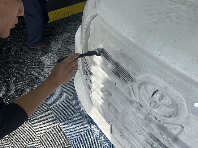 吹きかけが終わった後は、専用のブラシや刷毛を使ってタイヤホイール、タイヤハウス、グリルやエンブレムなどの細部の浮いてきた汚れを取り除きます。