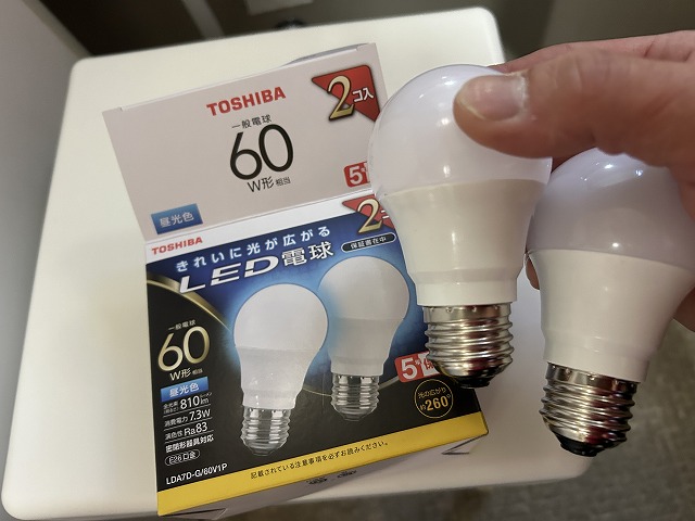 交換するLED電球は、東芝製の密閉形器具対応の60W形LED電球をご用意しました。