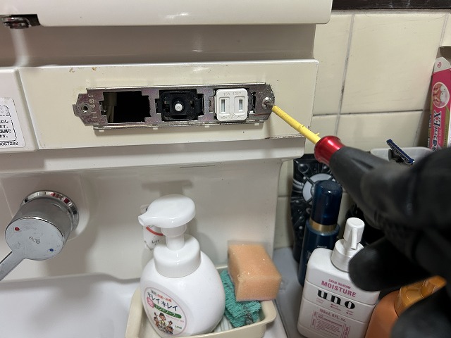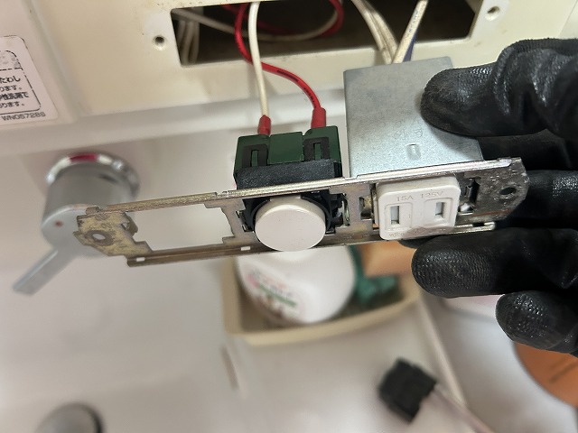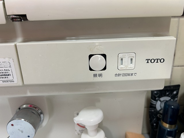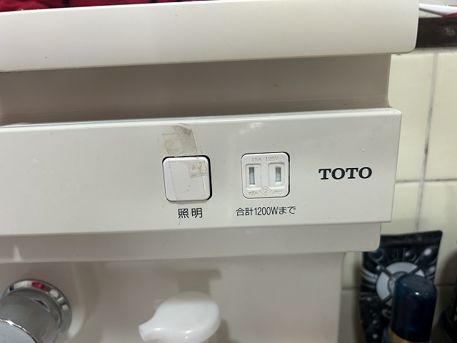 TOTO製の洗面化粧台の照明スイッチが時々飛び出してくるとのことで、見るとスイッチにセロハンテープを貼ってスイッチボタンが飛んでいかないようにされていました。