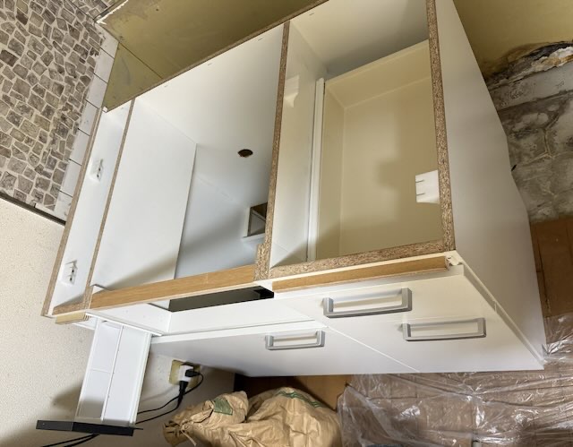 新しいキッチンを設置する前に、ガス配管が壁から突き出ているのでその位置に合わせて新しいキッチン台の壁にも穴をあけます。