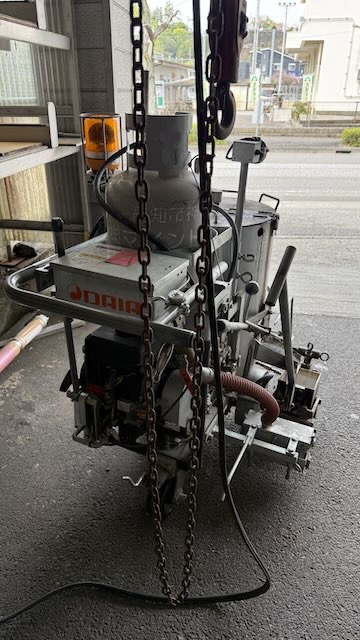こちらは道路工事などに使われているライン引きの機械です。車道の中央分離帯や横断歩道などに使われている白線はこのような機械を使って引かれています。