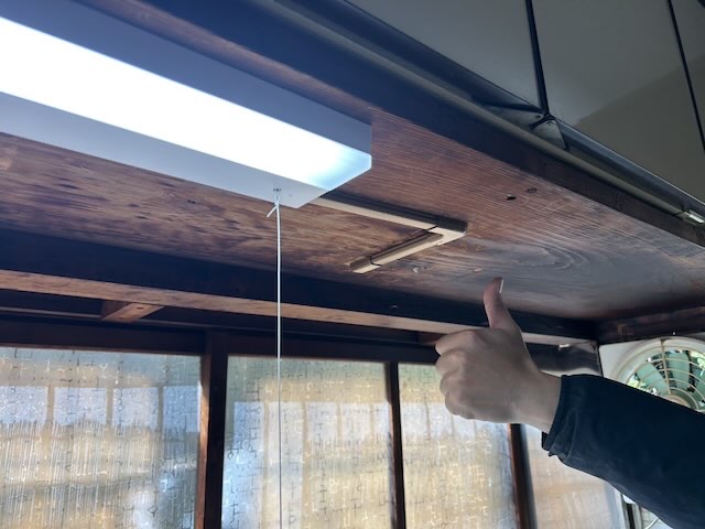 照明器具本体を取り付けて、配線をつないだら取付作業は終了、ブレーカーをあげて点灯確認をします。
